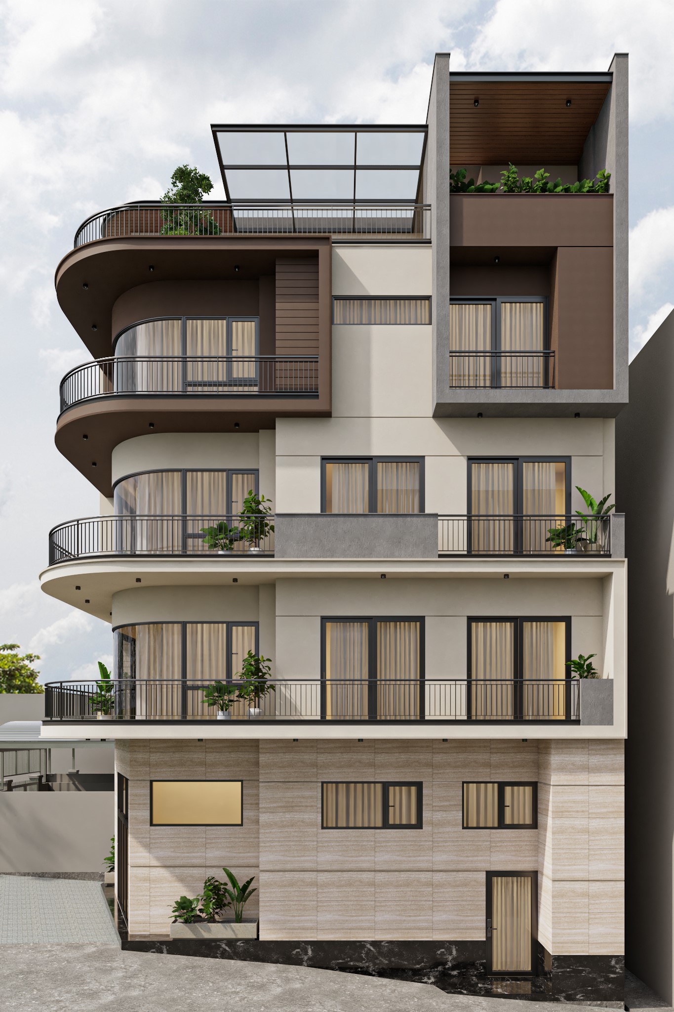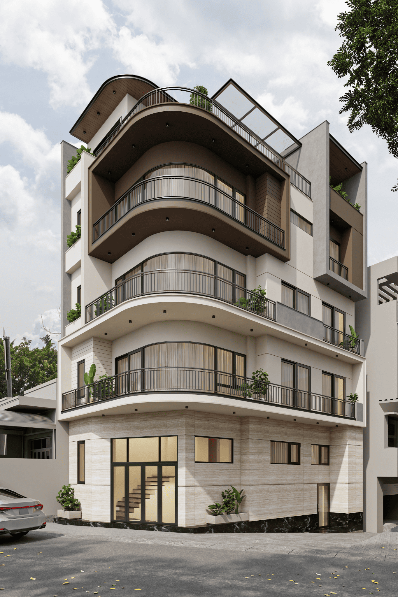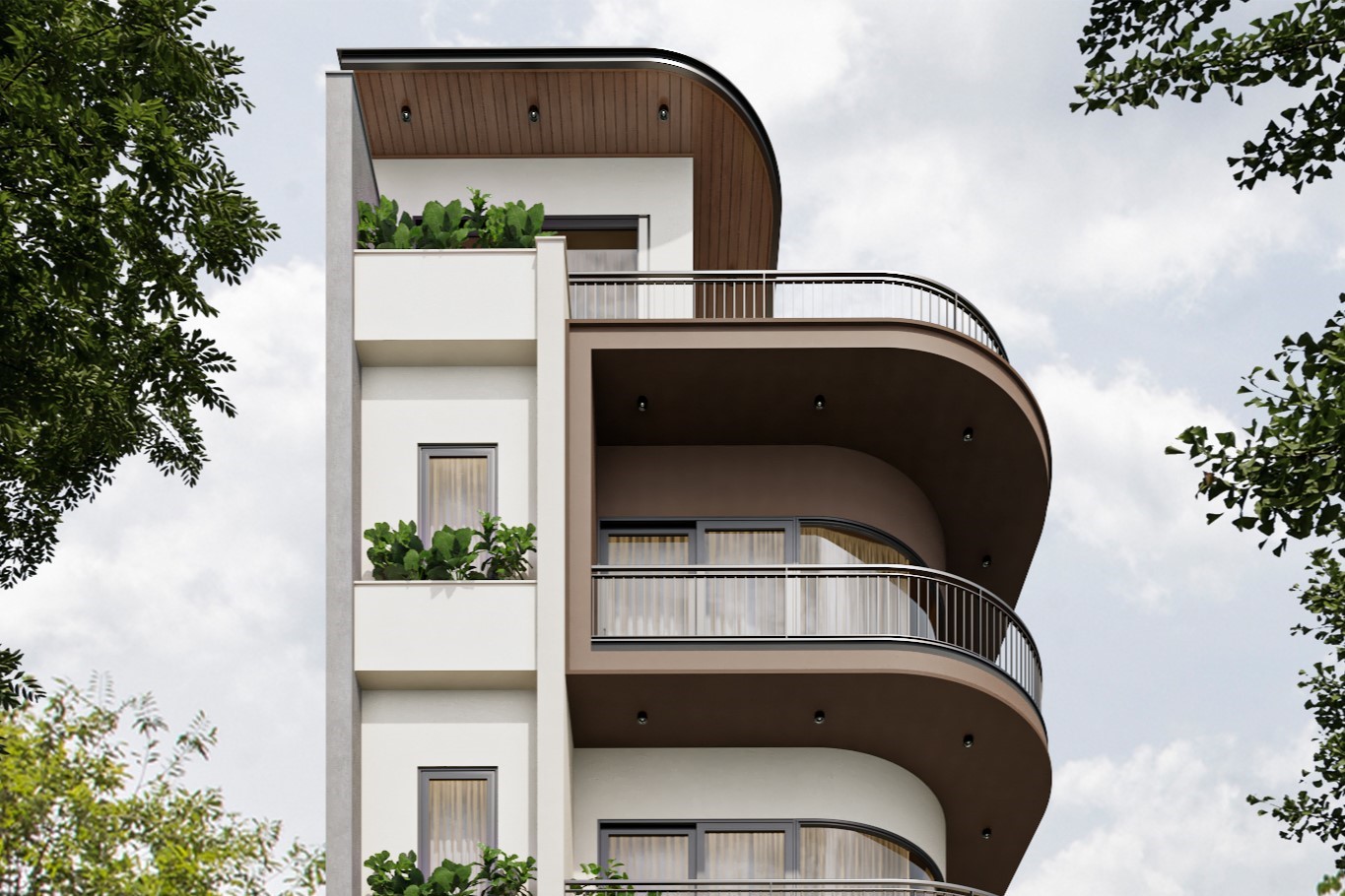 Tại Modul 5 Architects, mỗi công trình không chỉ là một không gian sống, mà còn là sự kết tinh giữa thẩm mỹ kiến trúc, công năng và trải nghiệm sống của gia chủ. Dự án nhà ở này được thiết kế với ngôn ngữ kiến trúc hiện đại, nổi bật bởi những đường cong mềm mại của hệ ban công và các mảng khối đan xen tinh tế.