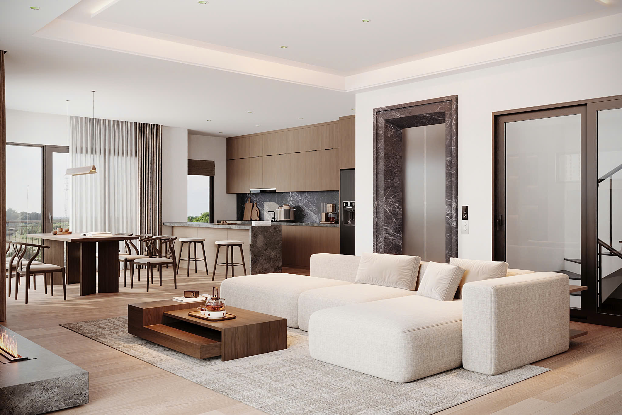 Công trình khai thác tối đa ánh sáng tự nhiên, thông gió và kết nối với không gian xanh, mang lại cảm giác thoáng đãng và thư thái trong nhịp sống đô thị. Sự kết hợp hài hòa giữa vật liệu, màu sắc trung tính và chi tiết kiến trúc tinh giản tạo nên một tổng thể sang trọng, bền vững theo thời gian.